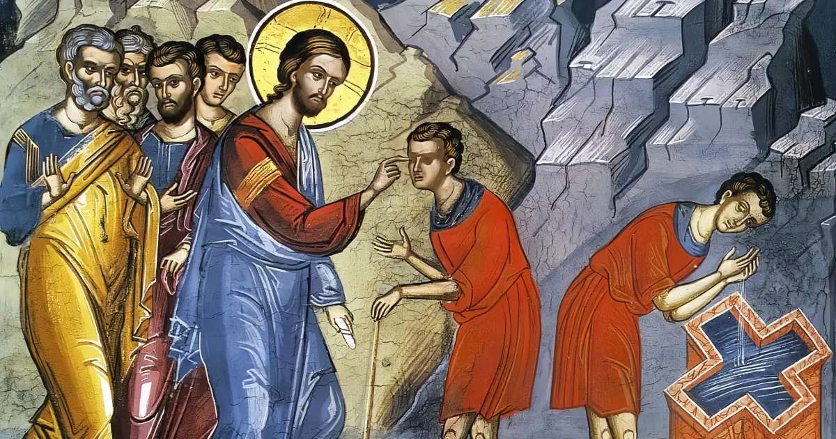耶稣用唾沫和了泥巴,敷在瞎子的眼睛上,再打发他到史罗亚水池去清洗眼睛,因此而治愈了瞎子。这样的操作过程却导致人们责难,指控耶稣违犯安息日的律法。